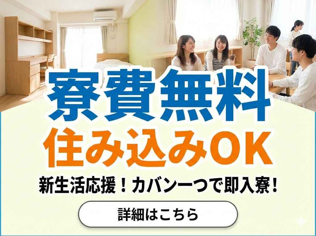寮が用意されており、入寮しながら働ける環境です。住まいを探す手間を減らしながら仕事をスタートできるため、新しい環境で働きたい方や遠方からの応募にも対応しやすい条件です。